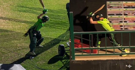 ویڈیو میں دیکھا جاسکتا ہے کہ انہوں نے پہلے بلے کو سائیڈ اسکرین کے ٹائر پر مارا پھر سیڑھیاں چڑھتے ہوئے بلے کو زور سے زمین پر مارا اور اندر چلے گئے۔
