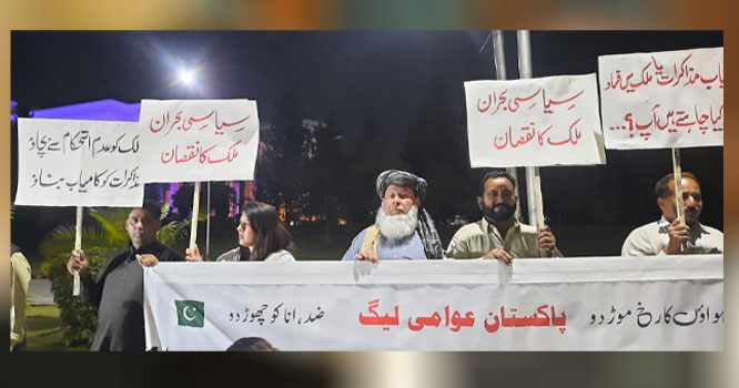 اسلام آباد (اے بی این نیوز )مذاکرات کے تیسرے دور کے موقع پر پارلیمنٹ ہاؤس کے باہر پاکستان عوامی لیگ کا مظاہرہ،مظاہرین نے پلے کارڈز اٹھا رکھے ہیں،مذاکرات کامیاب کرنے کے مطالبات درج تھے،مظا ہرے کے دوران مظاہرین نے کہا کہ خدارا مذاکرات کا موقع ضائع نہ کریں،سیاستدان حل تلاش کریں، پاکستان کو سانس لینے دیں،عمران […]