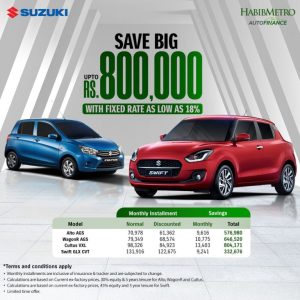 ایک ہفتہ قبل، کمپنی نے اپنے تمام ماڈلز (آلٹو، ویگن آر، سوئفٹ) کا احاطہ کرتے ہوئے ایک پروموشن کی نقاب کشائی کی، جو صارفین کو روپے تک کی بچت کے ساتھ اپنے خواب کو پورا کرنے کے قابل بناتی ہے۔ 800,000 حبیب میٹرو آٹو فنانس کے ساتھ، آپ کو اپنی مطلوبہ گاڑی پر خاطر خواہ بچت کرنے کا موقع ملتا ہے۔