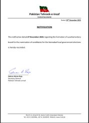 ذرائع کے مطابق 27 دسمبر کو جاری کیا گیا نوٹیفکیشن اب ختم کر دیا گیا ہے اور پارٹی قیادت کی جانب سے آئندہ دنوں میں نیا لائحہ عمل سامنے آنے کا امکان ہے۔