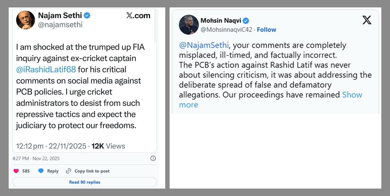 اس سے قبل پی سی بی کے سابق چیئرمین نجم سیٹھی نے ایک ٹوئٹ میں کہا تھا کہ ‘میں حیران ہوں کہ سابق کپتان راشد لطیف کے سوشل میڈیا پر پی سی بی کی پالیسیوں کے خلاف تنقیدی بیانات پر ایف آئی اے کی انکوائری شروع کردی گئی ہے’۔
