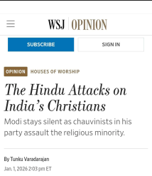 وال اسٹریٹ جرنل نے کہا کہ اینٹی کنورژن قوانین، پولیس کی بے عملی اور ریاستی رویہ، اقلیتوں کے خلاف تشدد کو عملی تحفظ فراہم کر رہا ہے، بھارت میں سیکولر ازم اب محض نعرہ، اقلیتیں پورے ملک میں علامتی اور منظم تشدد کا شکار ہیں، مودی کا بھارت فل کلاس جمہوریت نہیں، فل کلاس اکثریتی ریاست بن چکا ہے۔