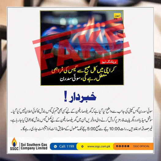 سوئی سدرن کمپنی نے سوشل میڈیا پر لکھا کہ کمپنی واضح کرتی ہے کہ گھریلو صارفین کے لیے گیس بند کرنے کا اعلان نہیں کیا گیا۔