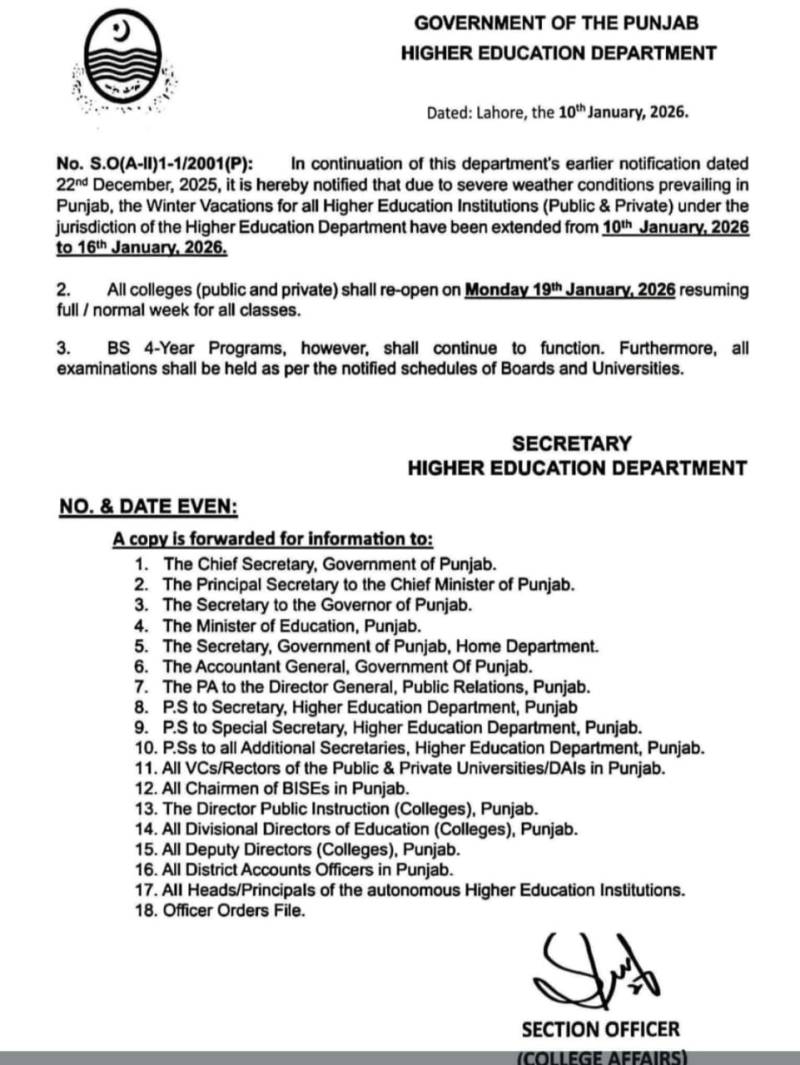 محکمہ ہائر ایجوکیشن نے چھٹی کا مراسلہ جاری کر دیا ہے، جس میں 19 جنوری سے نجی اور سرکاری کالجوں میں تعلیمی سرگرمیاں دوبارہ شروع کرنے کا حکم دیا گیا ہے۔