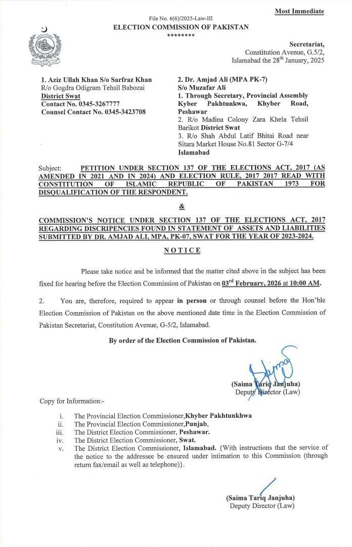 ذرائع کے مطابق الیکشن کمیشن نے ڈاکٹر امجد علی کو 3 فروری 2026 کو اسلام آباد میں پیش ہونے کی ہدایت جاری کی ہے۔ الیکشن کمیشن کی جانب سے جاری نوٹس میں مؤقف اختیار کیا گیا ہے کہ ان کے جمع کرائے گئے گوشواروں میں اثاثوں اور ظاہر کردہ آمدن میں فرق پایا گیا ہے، جس پر وضاحت طلب کی جائے گی۔