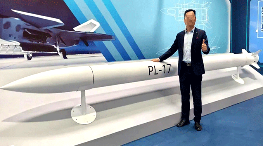 تصویر میں PL-17 میزائل یا اس کا ماڈل اسٹینڈ پر رکھا گیا ہے۔ ایک شخص میزائل کے سامنے کھڑا ہے، جس کا چہرہ ڈیجیٹل طور پر دھندلا ہوا ہے۔ زیادہ تر دفاعی ماہرین کا خیال ہے کہ تصویر میں نظر آنے والا میزائل ایک ماڈل ہے لیکن اس کا سائز بالکل اصل میزائل جیسا ہے۔