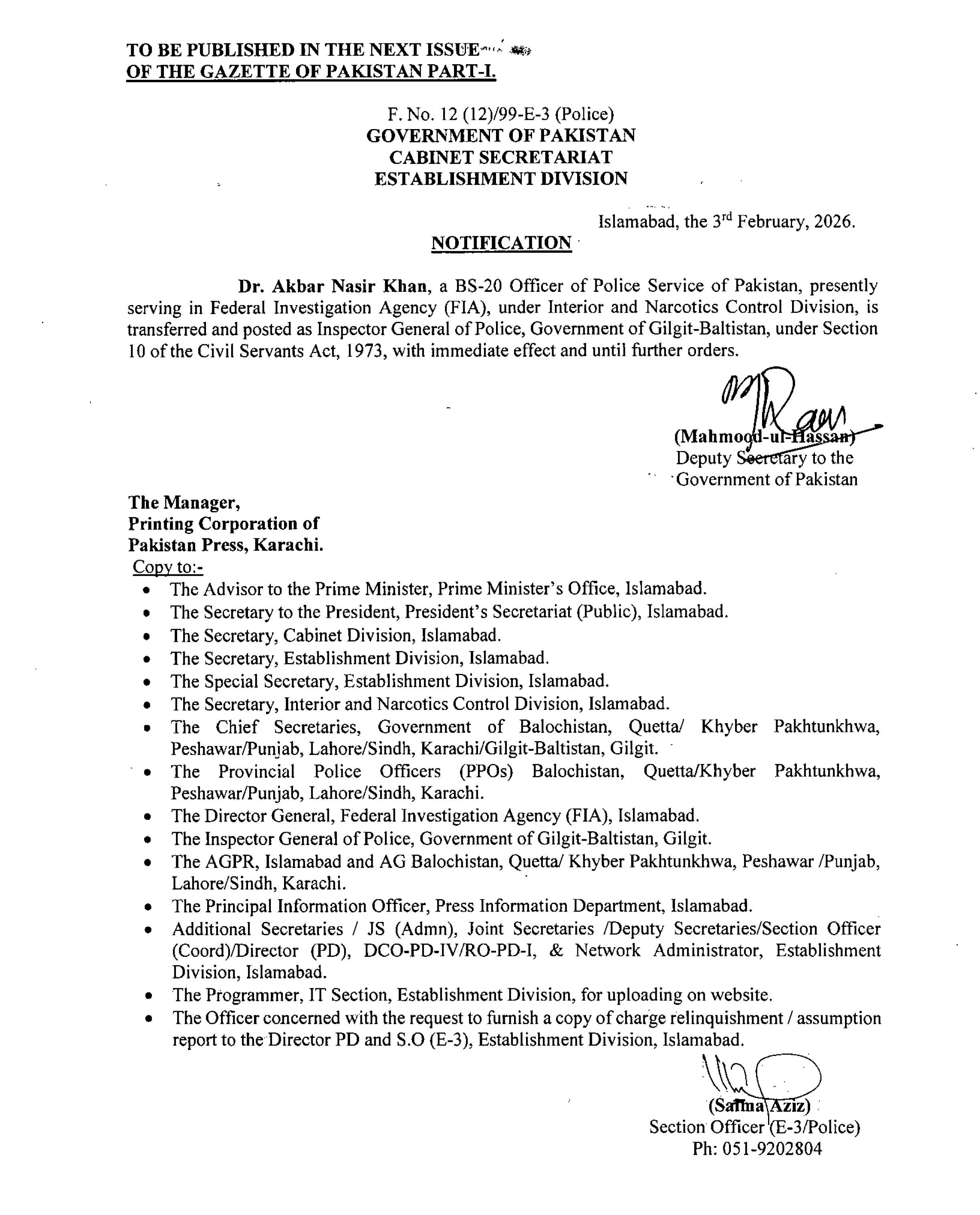اسٹیبلشمنٹ ڈویژن کی جانب سے جاری نوٹیفکیشن کے مطابق ڈاکٹر اکبر ناصر خان، جو اس وقت وفاقی تحقیقاتی ایجنسی (ایف آئی اے) میں خدمات انجام دے رہے تھے، کو فوری طور پر حکومتِ گلگت بلتستان کا انسپکٹر جنرل پولیس تعینات کر دیا گیا ہے۔