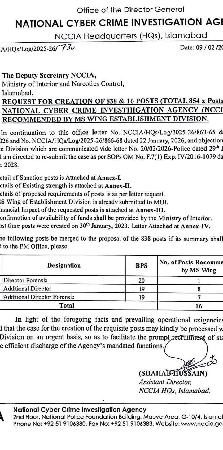 ذرائع کے مطابق ایجنسی نے وزارت داخلہ پاکستان کو گریڈ ایک سے گریڈ 18 تک کی 800 سے زائد نئی آسامیوں کی منظوری کیلئے درخواست دے دی ہے۔ بتایا گیا ہے کہ سائبر کرائم سے متعلق تقریباً ایک لاکھ 40 ہزار شکایات ایجنسی میں زیر التوا ہیں جبکہ افرادی قوت کی کمی کے باعث کام کا دباؤ مسلسل بڑھ رہا ہے۔