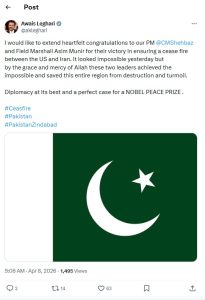 وفاقی وزیر اویس لغاری نے اپنے پیغام میں کہا کہ امریکہ اور ایران کے درمیان جنگ بندی کو یقینی بنانا ایک بڑا کارنامہ ہے، جس میں وزیراعظم اور آرمی چیف کی قائدانہ صلاحیتیں اور محنت قابل تعریف ہیں۔