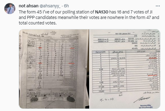 سوشل میڈیا صارفین حلقہ این اے 130 میں ووٹوں کی گنتی پر تنقید کرتے دکھائی دے رہے ہیں۔ایک صارف نے دونوں فارمز کی تصویر ایکس اکاؤنٹ پر پوسٹ کرتے ہوئے لکھا ’ میرے پاس حلقہ این اے 130 کے پولنگ سٹیشن کے فارم 45 میں جماعت اسلامی اور پیپلز پارٹی کے امیدواروں کے 16 اور 7 ووٹ ہیں جبکہ ان کے ووٹ فارم 47 میں کہیں نہیں ہیں۔