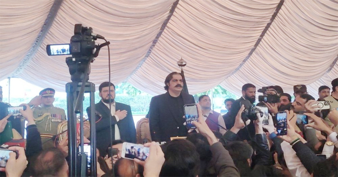 پشاور(نیوزڈیسک) پی ٹی آئی رہنما علی امین گنڈا پور نے وزیراعلیٰ کے عہد ے کا حلف اٹھا لیا۔ گورنر حاجی غلام علی نے نو منتخب وزیراعلیٰ علی امین گنڈا پور سے حلف لیا۔