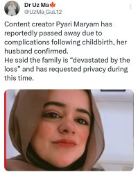 اسلام آباد(اے بی این نیوز)معروف سوشل میڈیا مواد کی تخلیق کار پیاری مریم مبینہ طور پر بچے کی پیدائش کے بعد پیدا ہونے والی طبی پیچیدگیوں کے باعث انتقال کر گئی ہیں۔ اس افسوسناک خبر کی تصدیق ان کے شوہر نے کی ہے۔