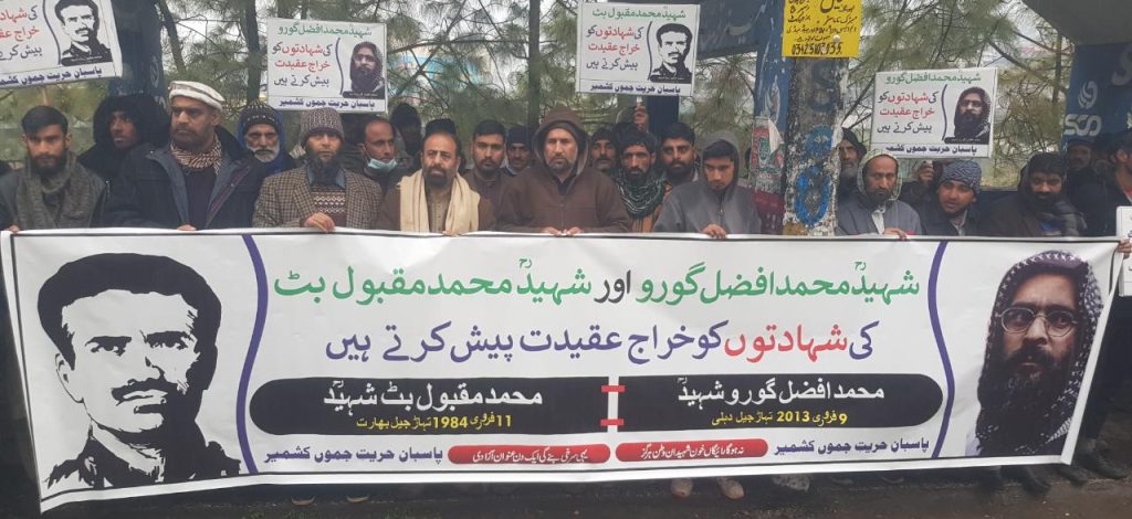 شرکاء دیگر شہداء جموں کشمیر بابائے حریت سید علی شاہ گیلانی شہیدؒ، محمد اشرف خان صحرائی شہیدؒ، میرواعظ مولوی محمد فاروق شہیدؒ، خواجہ عبدالغنی لون شہیدؒ اور برہان وانی شہیدؒ کے حق میں بھی نعرے بلند کرتے رہے ۔ شہید افضل گورو چوک دومیل میں ریلی سے چیئرمین پاسبان حریت عزیراحمدغزالی، حریت رہنماء مشتاق السلام، عثمان علی ہاشم ، محمد اسحاق شاہین، محمد فیاض، فیصل فاروق، الف دین ڈار، خواجہ محمد پرویز، سید محمود شاہ اور دیگر مقررین نے خطاب میں کہا کہ ریاست جموں کشمیر کے دو عظیم بیٹوں نے بھارتی استعماری قبضے سے قومی آزادی کے حصول کیلئے پھانسیوں پے چڑ جانا قبول کرلیا لیکن بھارت کے بدترین ظالم سامراج کے سامنے سرنگوں نہیں کیا۔ مقررین نے دونوں عظیم راہنماؤں شہیدؒ محمد مقبول بٹ اور شہیدؒ محمد افضل گورو کو انکی لازوال اور انمٹ جدوجہد پر خراج عقیدت پیش کرتے ہوئے کہا کہ کشمیر کے دو نڈر بے باک راہنماؤں نے بھارت کے ظالمانہ فوجی قبضے سے ریاست جموں کشمیر کے محفوظ اور آزاد سیاسی مستقبل کیلئے جدوجہد کرتے ہوئے جام شہادت نوش کیا ۔ بھارت کی متعصب اور جانبدار عدلیہ نے محمد مقبول بٹ شہیدؒ کو 11 فروری 1984 اور شہیدؒ محمد افضل گورو کو 9 فروری 2013 کو دہلی کی تہاڑ جیل میں تختہ دار پے چڑھایا تھا بھارتی حکمرانوں کا خوف اور انکی بد نیتی نے دونوں شہدا کی میتیں جیل میں ہی دفن کردیں۔ مقررین نے کہا کشمیر کے ان سرفروش بیٹوں نے پھانسیوں کے پھندوں کو قبول کر لیا لیکن بھارت کی جبری حاکمیت اور ریاست جموں کشمیر پر اس کے غیر قانونی فوجی قبضے کو تسلیم نہیں کیا۔ مقررین نے کہا کہ بھارت یہ جان لے کشمیری عوام اپنی قومی آزادی اور رائے شماری کے مبنی بر حق مطالبے سے کبھی دستبردار نہیں ہوں گے۔ کشمیری عوام اپنے لاکھوں شہیدوں کے مقدس لہو اور قربانیوں کا تحفظ کرتے ہوئے بھارتی دہشت گرد سامراج کیخلاف پوری ایمانی قوت کے ساتھ جدوجہد جاری رکھیں گے۔ پاسبان حریت کے زیر اہتمام ریلی کے شرکاء نے افضل گورو چوک سے سرینگر شاہراہ پر مارچ کیا۔