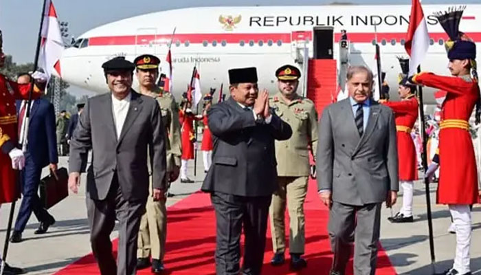 سرکاری میڈیا کے مطابق اسلام آباد پہنچنے پر صدر آصف علی زرداری اور وزیراعظم شہباز شریف نے انڈونیشیا کے صدر پرابووو سوبیانتو اور اعلیٰ سطح کے وفد کا استقبال کیا، انہیں 21 توپوں کی سلامی دی گئی، بچوں نے پھول پیش کیے۔