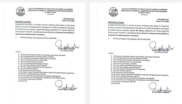 مظفر آباد ( اے بی این نیوز )آزاد حکومت ریاست جموں و کشمیر نے اہم تقرری کا نوٹیفکیشن جاری کر دیا گیا۔ آزاد حکومت ریاست جموں و کشمیر نے اہم سرکاری تقرری کا اعلان کیا ہے۔ چوہدری حسن اشرف کو چیئرمین وزیراعظم معائنہ و عملدرآمد کمیشن کے طور پر تعینات کیا گیا ہے۔