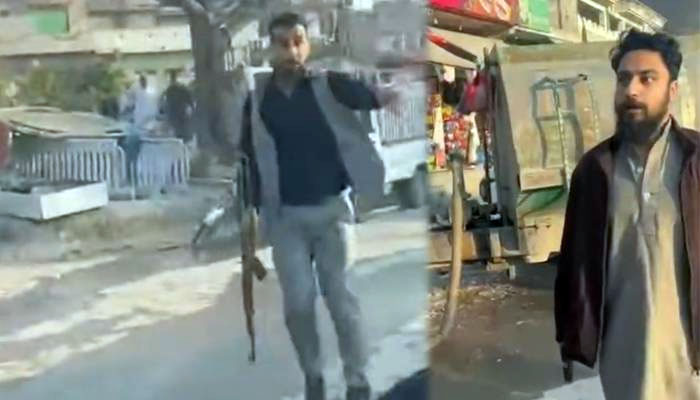 دکاندار اور ساتھی کی اسلحہ لہرانے کی ویڈیو منظر عام پر آ گئی۔ ویڈیو میں دکاندار اور ساتھی کو جدید اسلحہ لہراتے دیکھا جاسکتا ہے ۔