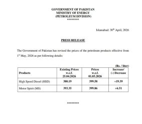 یہ نئی قیمتیں یکم مئی 2026 سے نافذ العمل ہوں گی، جس کے بعد ملک بھر میں پٹرول پمپس پر یہی نرخ لاگو ہوں گے۔شہریوں کا کہنا ہے کہ پہلے ہی بڑھتی ہوئی مہنگائی نے زندگی مشکل بنا دی ہے، اور پٹرولیم مصنوعات کی قیمتوں میں مسلسل اضافہ عام آدمی کیلئے بڑا چیلنج بنتا جا رہا ہے۔