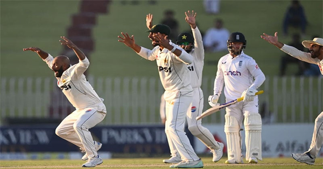 پہلے روز پاکستان نے ٹاس جیت کر پہلے بیٹنگ کا فیصلہ کیا تھا۔ پاکستان کی جانب سے کپتان شان مسعود 87 جبکہ عبداللہ شفیق 57 رنز بنا کر آؤٹ ہوئے تھے۔