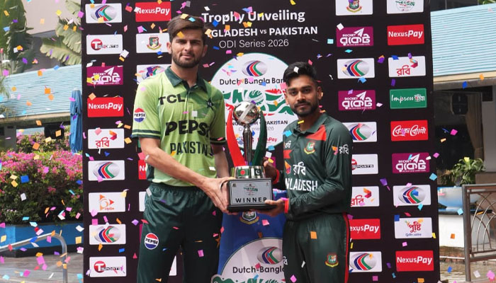 ڈھاکہ(اے بی این نیوز)ڈھاکا میں پاکستان بنگلا دیش ون ڈے سیریز کی ٹرافی کی رونمائی کردی گئی۔ ٹرافی کی رونمائی پاکستان ون ڈے کپتان شاہین آفریدی اور بنگلہ دیشی کپتان مہدی حسن میراز نے کی، پاکستان اور بنگلہ دیش کا پہلا ون ڈے کل کھیلا جائے گا۔